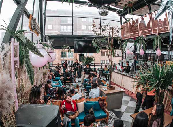 From its terrace, you can admire breathtaking panoramic views of Bogotá, with the imposing Monserrate hill and the colonial rooftops of downtown as a backdrop. At nightfall, the place comes alive with soft, modern lighting that highlights the chic and cozy atmosphere. The décor mixes industrial and natural, creating a relaxed yet elegant space, ideal for an outing with friends or for a more intimate evening.