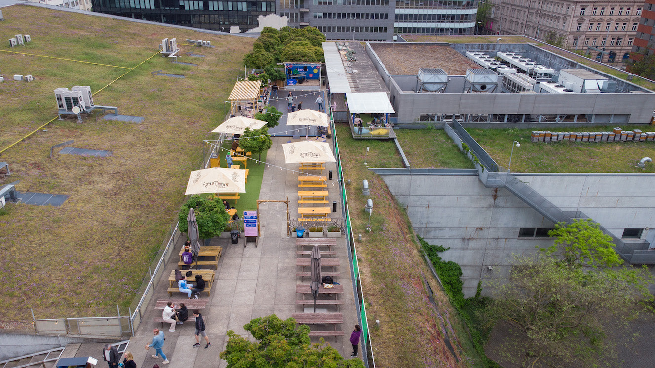 Bien qu'il existe une agréable terrasse au-dessus du centre commercial Nový Smíchov depuis son ouverture en 2001, ce n'est que depuis quelques années qu'elle est utilisée comme un endroit où l'on peut se détendre avec des boissons, des vibrations et une vue.