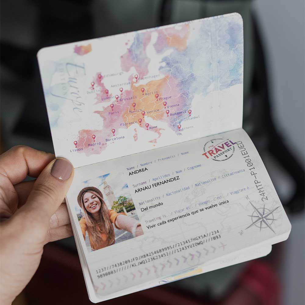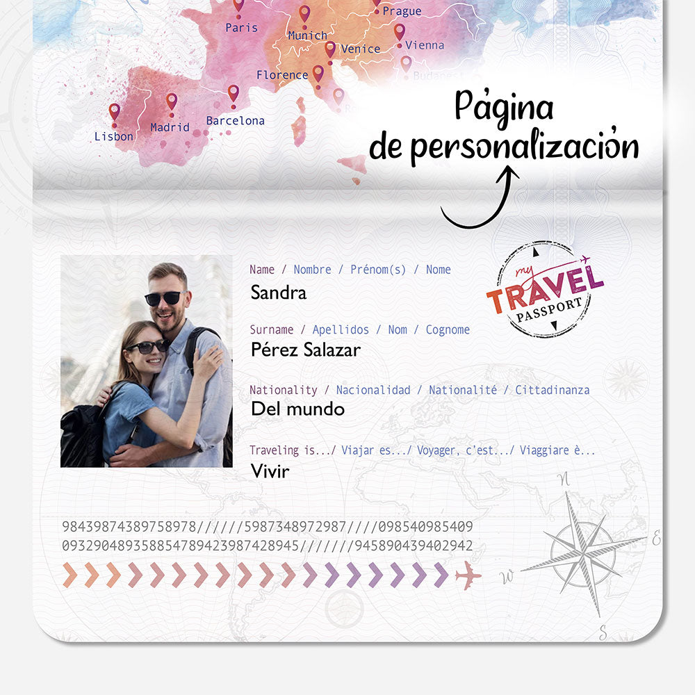 O My Travel Passport pode ser personalizado com os seus dados ou os dados da pessoa a quem o quer oferecer.