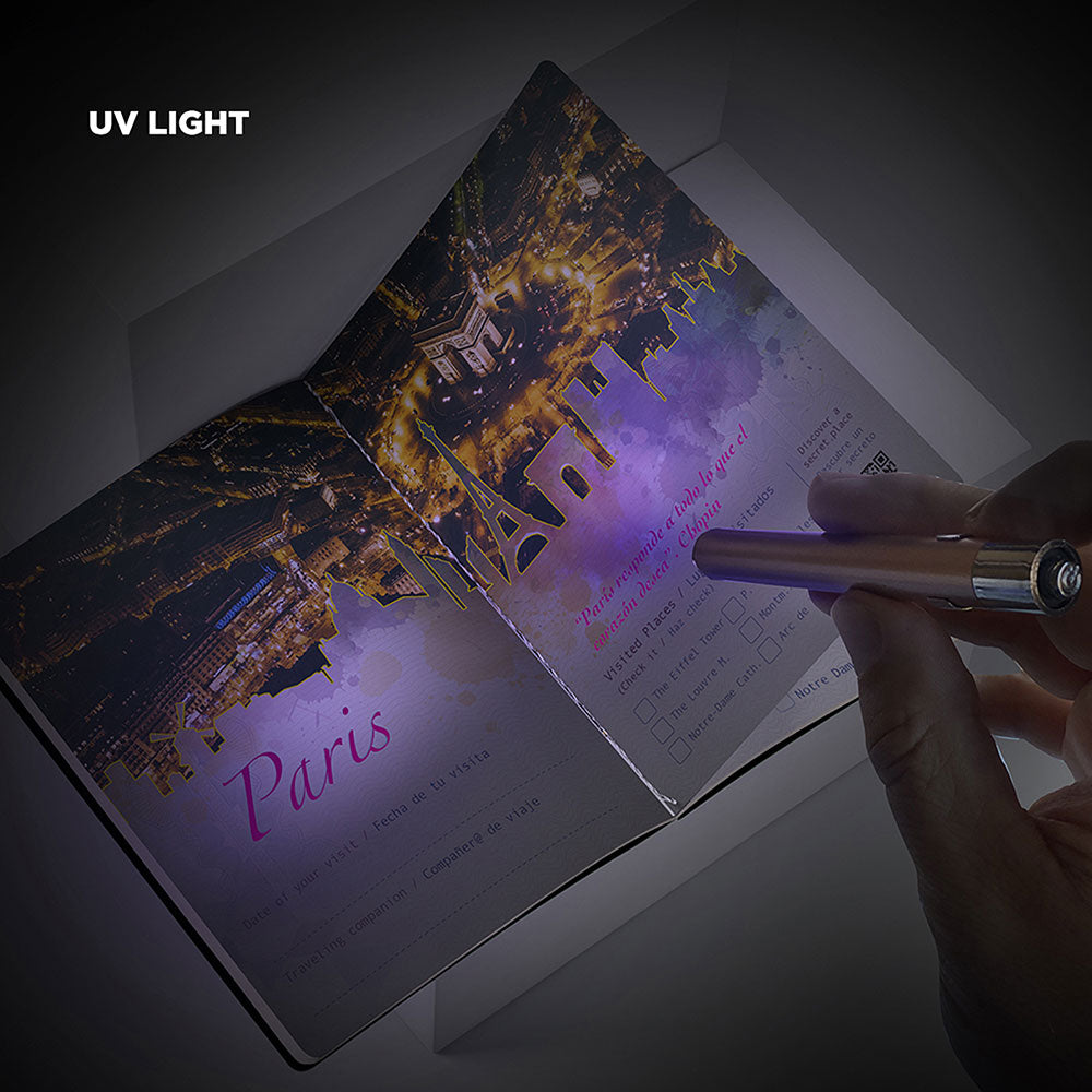 Através da lanterna que lhe fornecemos, poderá contemplar as fascinantes imagens ultravioletas de cada país.